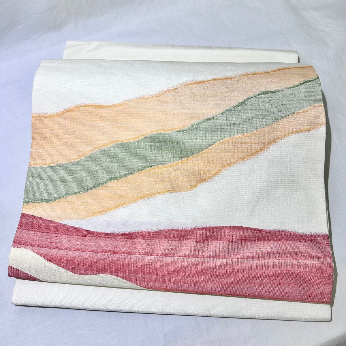 - ★美品★名古屋帯 九寸 9寸 正絹 抽象模様 織り なごや帯 白地 カジュアル オレンジ 赤 緑 着物 和服 紬 小紋 レディース (01127①並