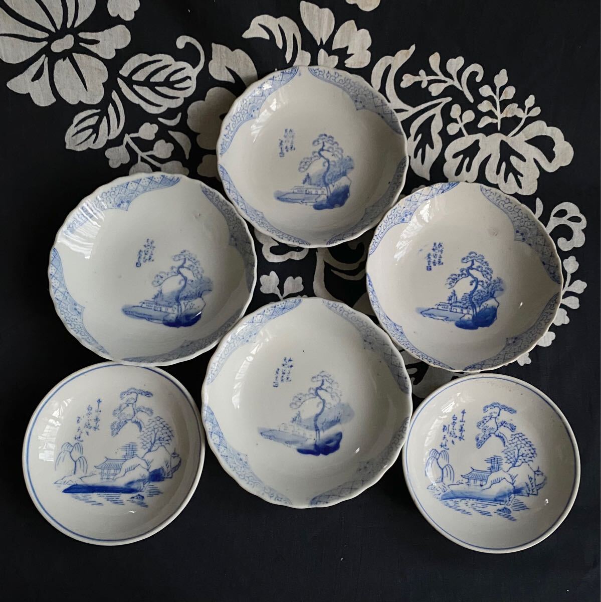 - 【戦中食器 統制陶器 皿六枚】時代物 印判手 統制食器 山水 風景画 輪花皿 岐964 4枚 小皿 岐387 2枚