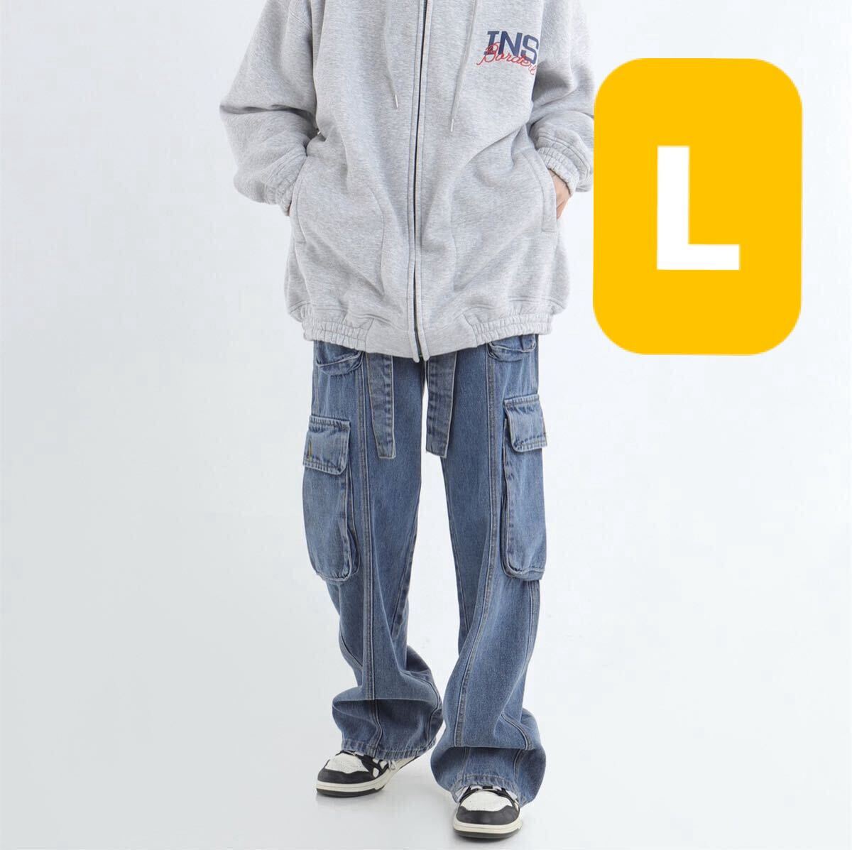 - デニム ワイドレッグ ジーンズ ワイドパンツ ワイドデニム ルーズパンツ ボトムス パンツ メンズ レディース ベルト付き ストリート 青 L