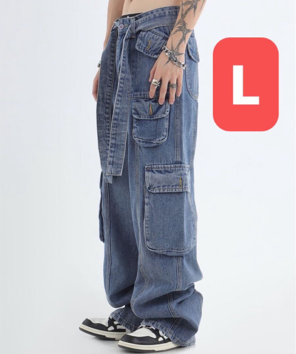 > デニム ワイドレッグ ジーンズ ワイドパンツ ワイドデニム ルーズパンツ ボトムス パンツ メンズ レディース ベルト付き ストリート 青 L