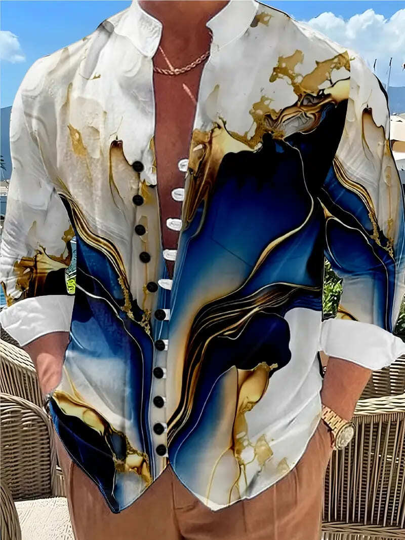 > マーブル柄 長袖 マオカラーシャツ 239 白×青 ドレスシャツ Yシャツ 派手 柄シャツ スーツ ホスト ヤクザ 服 メンズ ファッション