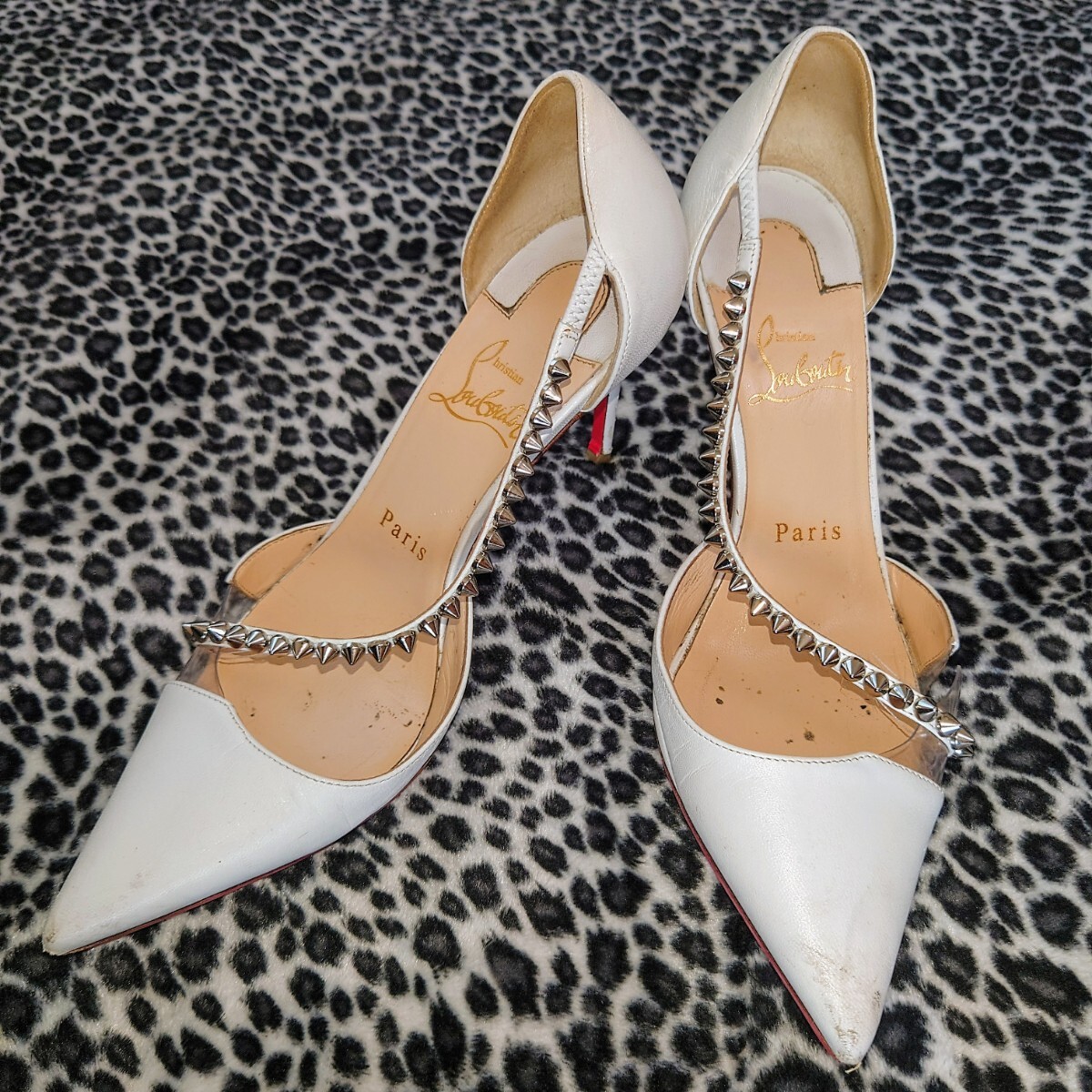 - ☆クリスチャン・ルブタン☆美脚・白・レザーパンプス・ピンヒール・ポインテッドトゥ・爪先尖り・ハイヒール・中古・使用感あり・愛用品