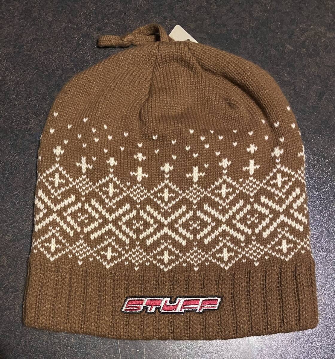 > 米製デッドストック90sオールドSTUFFニットキャップ雪柄ビーニーFreeフリーサイズ茶白90年代デッド米国製USA製US製アメリカ製ビンテージy2k