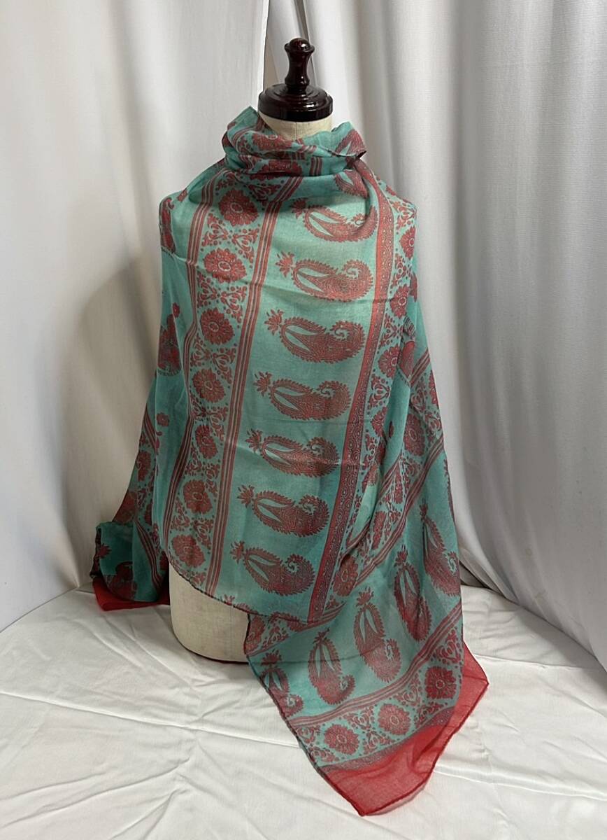 - 送料無料♪ストール 大判 象と草花柄 グリーン×レッド 薄手 長さ約176cm マサラ オリエンタル
