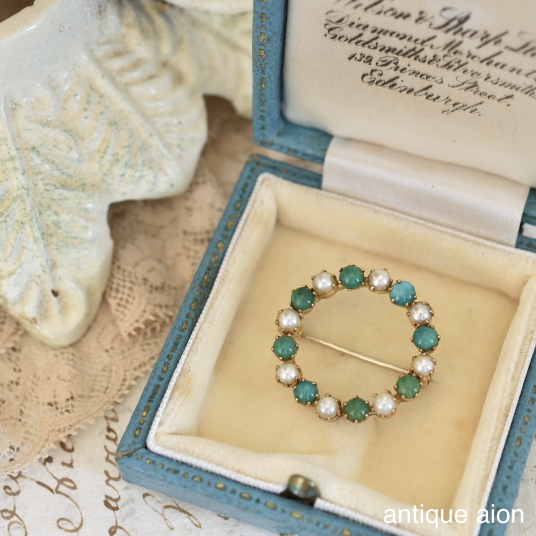 - 英国ヴィンテージ 1940年前後頃 9ctゴールド 天然ターコイズと天然シードパールのサークルブローチ