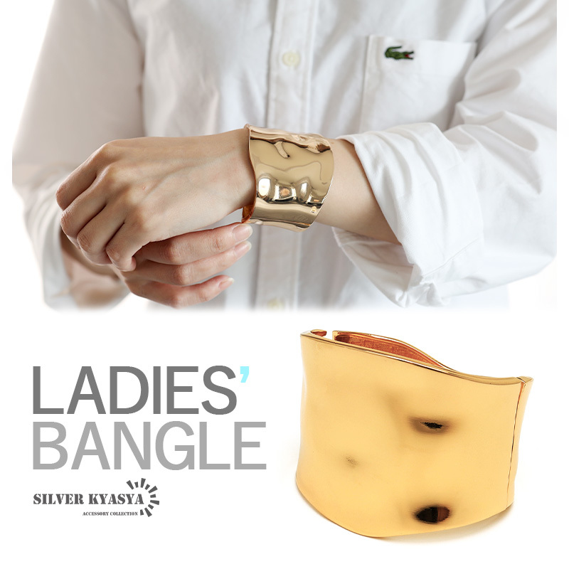 - バングル レディース 太幅 ワイド 槌目 変形 大人 腕輪 ゴールド 開閉式 ワイドバングル