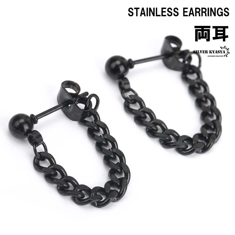 - 両耳 ブラック チェーンピアス ステンレスピアス 黒 韓流ピアス 喜平チェーン 個性派ピアス 2点