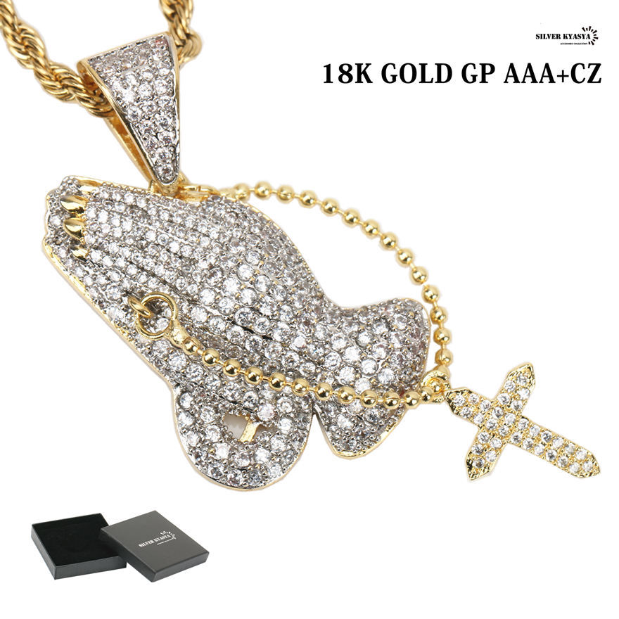 - キラキラ 祈り手 ネックレス 18KGP 祈祷 ゴットハンド ネックレス パヴェCZダイヤ ロープチェーン60cm 専用BOX付属