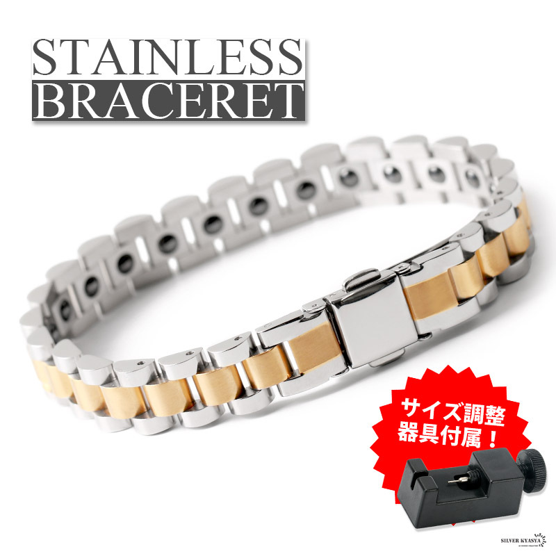 - 幅10mm メンズブレスレット ステンレス ゴールド シルバー メタルバンド 時計バンド ヘマタイト アレルギー対応 調整器具