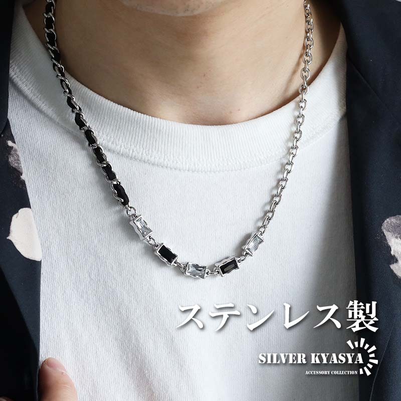 - ステンレスネックレス ジルコニアネックレス チェーンネックレス シルバー ブラック 編み込み cz 金アレ対応