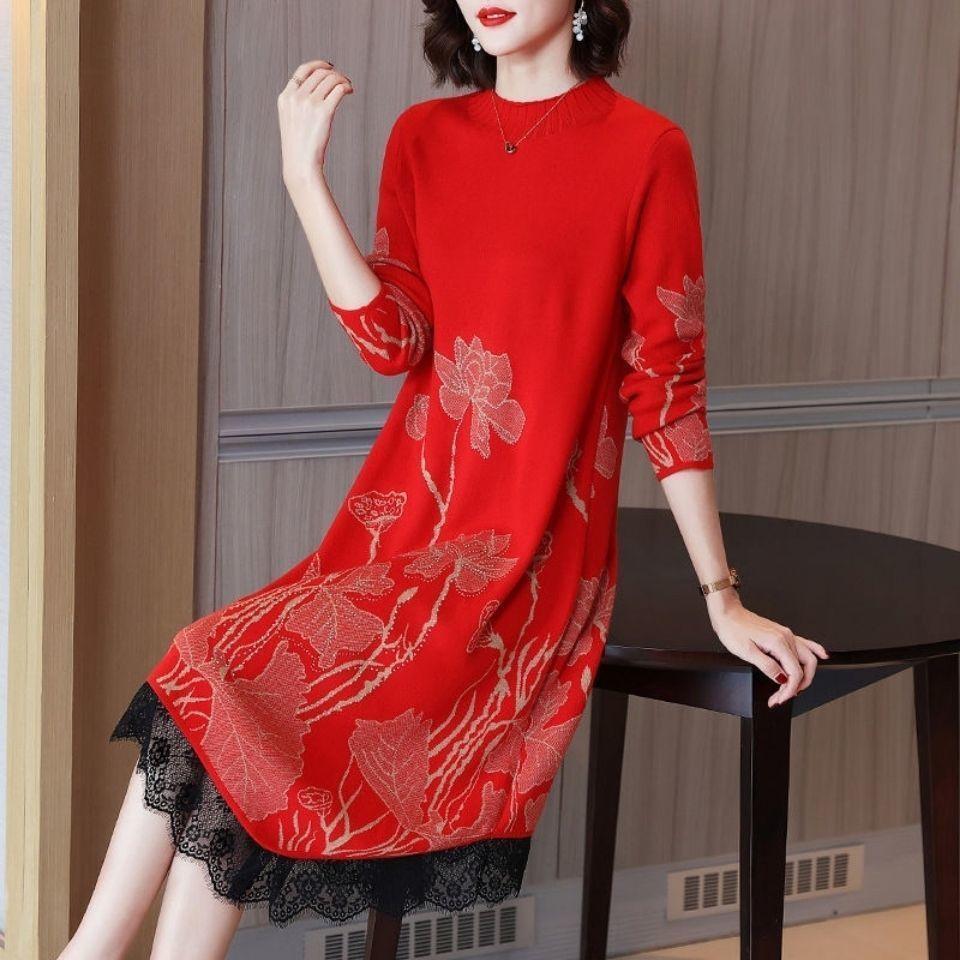 - レッド花柄★Lサイズ 長袖ひざ丈 ニットワンピースおしゃれ