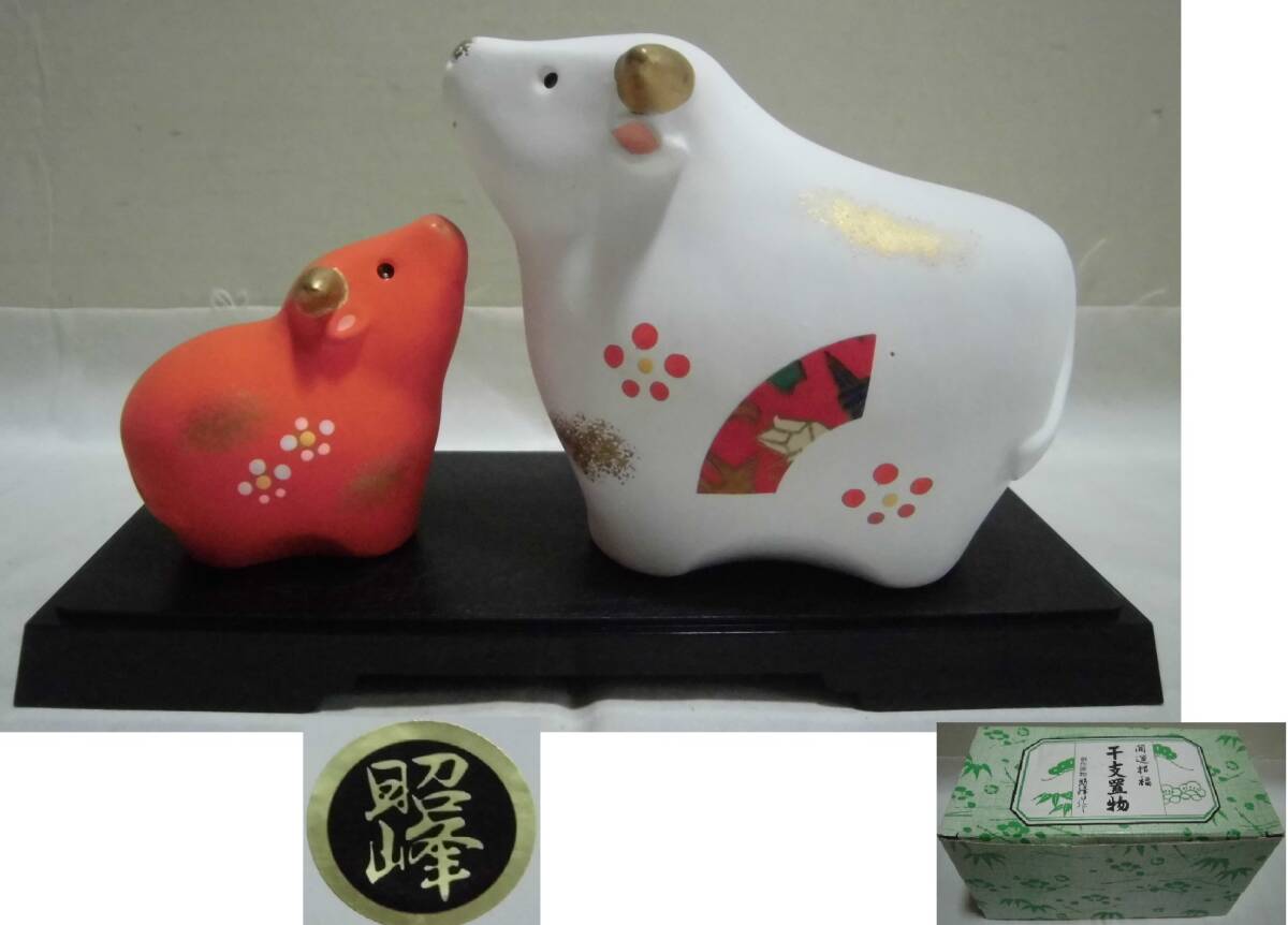 > 干支置物 丑 親子 計2体 飾り台 昭峰作 箱入り 紅白 色絵 金彩 牛 うし 陶人形 土人形 招福 開運 縁起物 飾り物 オブジェ 工芸品 レトロ