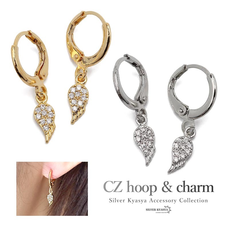 - (シルバー) チャーム ピアス CZランク ビジュー 18K GP チャームピアス 羽 翼 小ぶり 両耳用 2点セット