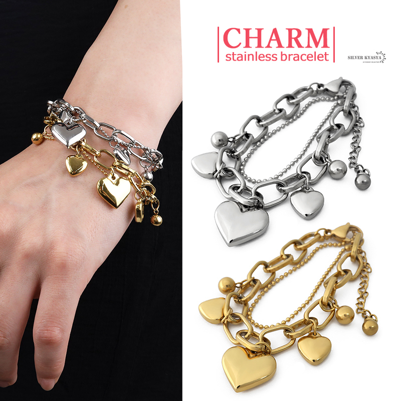 > (ゴールド) チャームブレスレット ステンレス ゴールド シルバー 2連 重ね付け あずき チェーン チャーム ハート gold