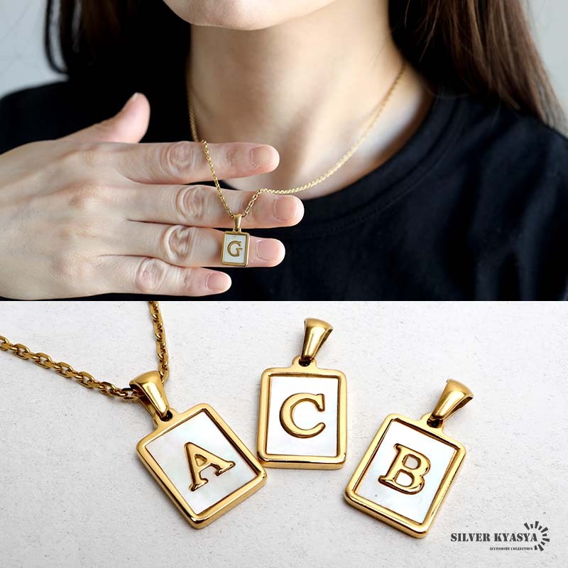 > (F、50cm) イニシャルネックレス ゴールド ホワイト スクエア ステンレス 18KGP あずきチェーン 金属アレルギー対応