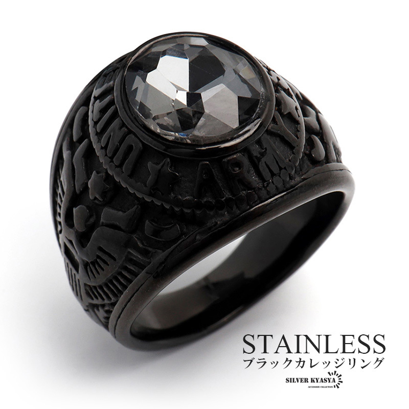 - (19号) ステンレス素材 カレッジリング ブラック 大粒ジルコニア スモーク リング 指輪 一粒リング イーグル 黒