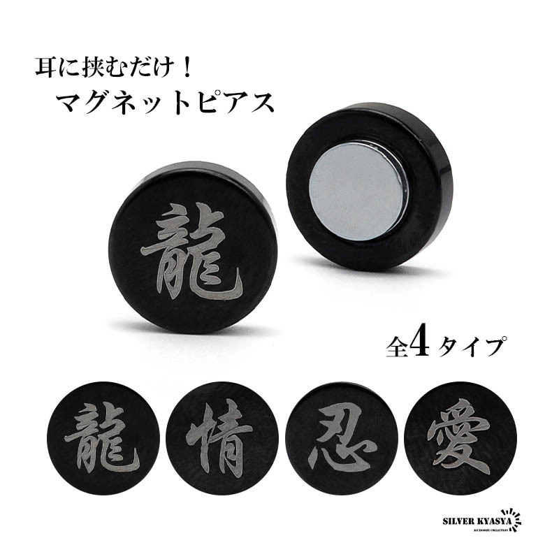> (A-龍) マグネットピアス 磁石 2点セット 漢字 メンズ イヤリング イヤーカフ 両耳用 ピアス ステンレス つけっぱなしOK