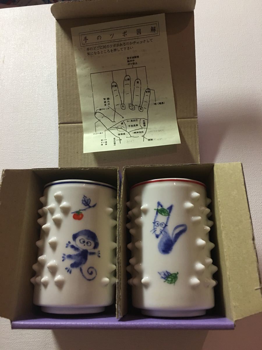 > 夫婦湯呑み★健脳★手のツボ★誕生日、記念日ギフトに★未使用新品★撮影で開封★検品済み★猿・狸・狐★健康グッズ