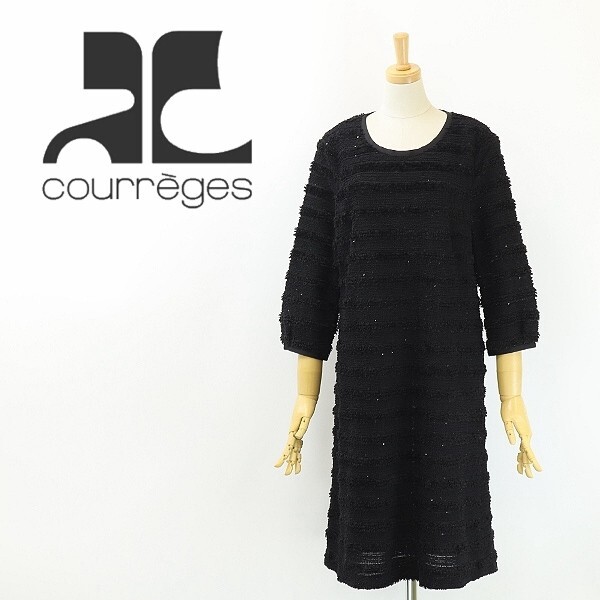 - ◆courreges クレージュ スパンコール装飾 七分袖 ワンピース 黒 ブラック 38