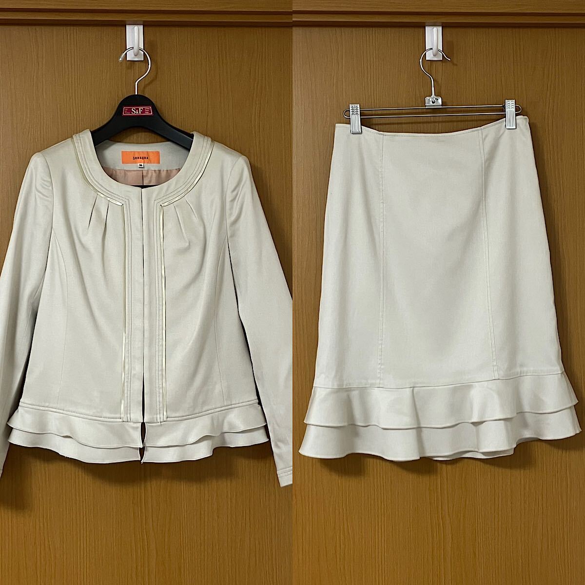 - スーナウーナ sunauna セレモニースーツ フリル ベージュ ノーカラー