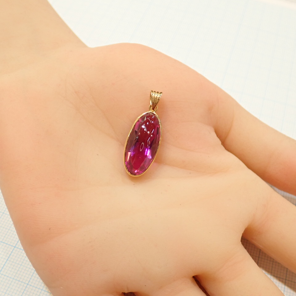 - ■K18 合成ピンクサファイアペンダントトップ■覆輪留め■ビビットピンクカラー■アンティーク 昭和レトロ■指輪■中古磨き仕上げ■