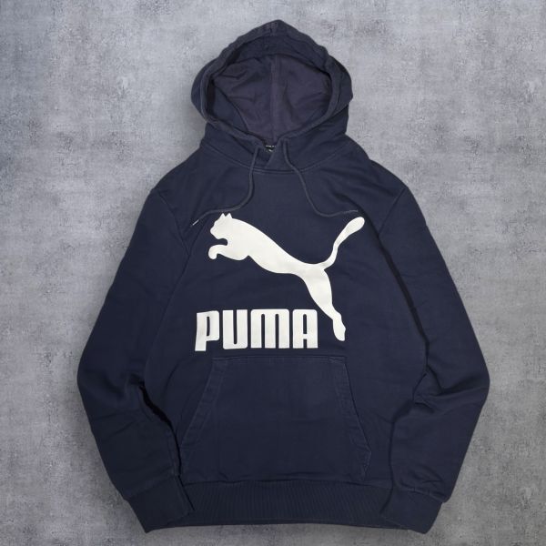 - ★BIGロゴプリント★PUMA プルオーバー パーカー sizeS ネイビー系 プーマ 古着 クリーニング プレス済み 1964