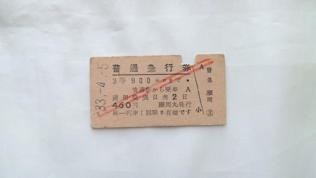 - ▼国鉄・青函連絡船摩周丸発行▼青森から3等900kmまで普通急行券▼A型硬券昭和33年