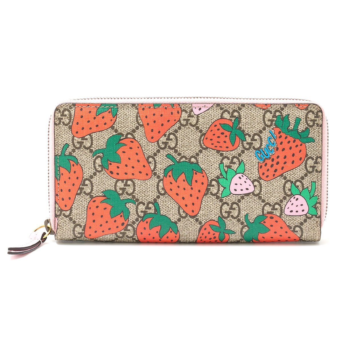 > GUCCI グッチ GGスプリーム ストロベリープリント ジップアラウンドウォレット 573865 長財布 レザー ベージュ×ピンク×ゴールド金具
