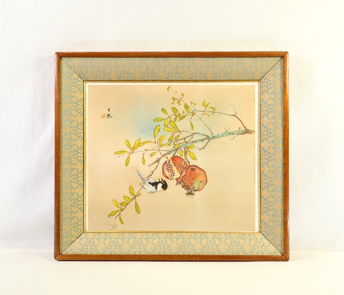 - 真作 東原方僊 日本画「柘榴」画 41.5×36cm 岡山県出身 帝展無鑑査 竹内栖鳳に師事 繊細な描写と柘榴の鮮やかな色合い 四十雀と石榴 10394