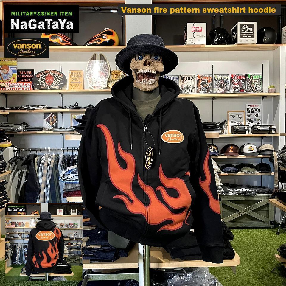 - VANSON バンソン NVSZ-2303 ファイヤーパターン エンブレム刺繍 スウェット 裏毛 ジップパーカー Lサイズ ブラック×オレンジ フレイム
