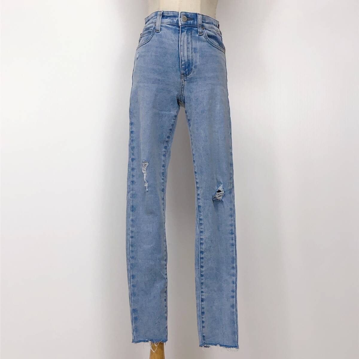 > YX856美品UNIQLO ユニクロ ディースパンツデニムロング丈サイド・後ろポケット水色無地綿素材含カジュアルおしゃれカジュアルデニムコーデ