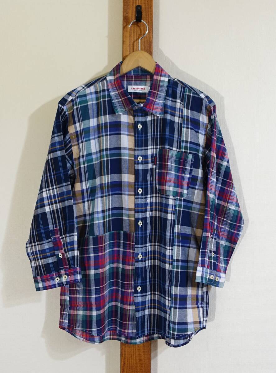 - 美品★INSPIRE/インスパイア◇シャツ 7分袖 7分シャツ リネン混 麻混 マドラス風チェック クレイジーパターン 岐阜武 GIFUTAKE