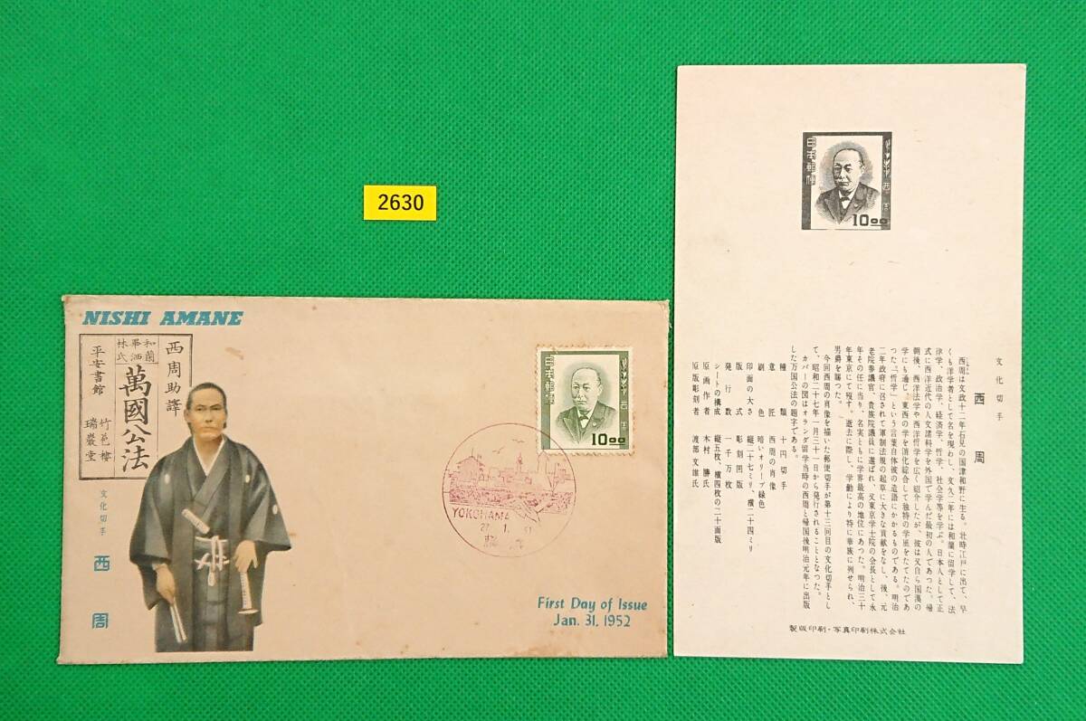 - FDC/文化人シリーズ/西周/初日印/横浜風景印/解説書有り/1952年1月31日/初日カバー/№2630