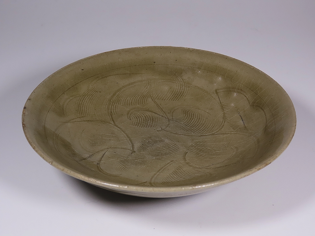 - 中国の陶器.龍泉/耀州窯.珠光青磁.お皿.刻花文.汚れやジュカンがありますが爪にかかる傷はありません。