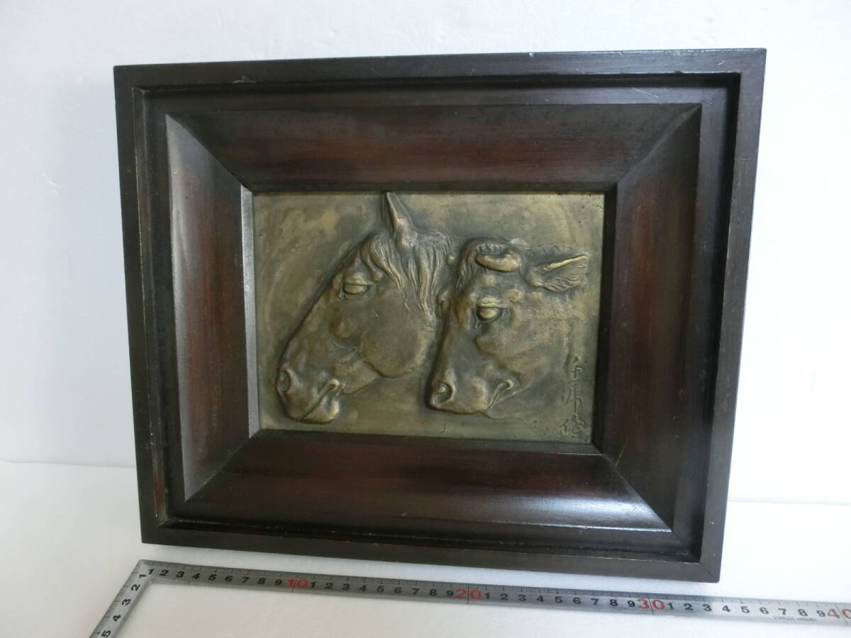- 岩田千虎 彫刻家 明治 昭和 1893-1966年 牛と馬 銅板 レリーフ