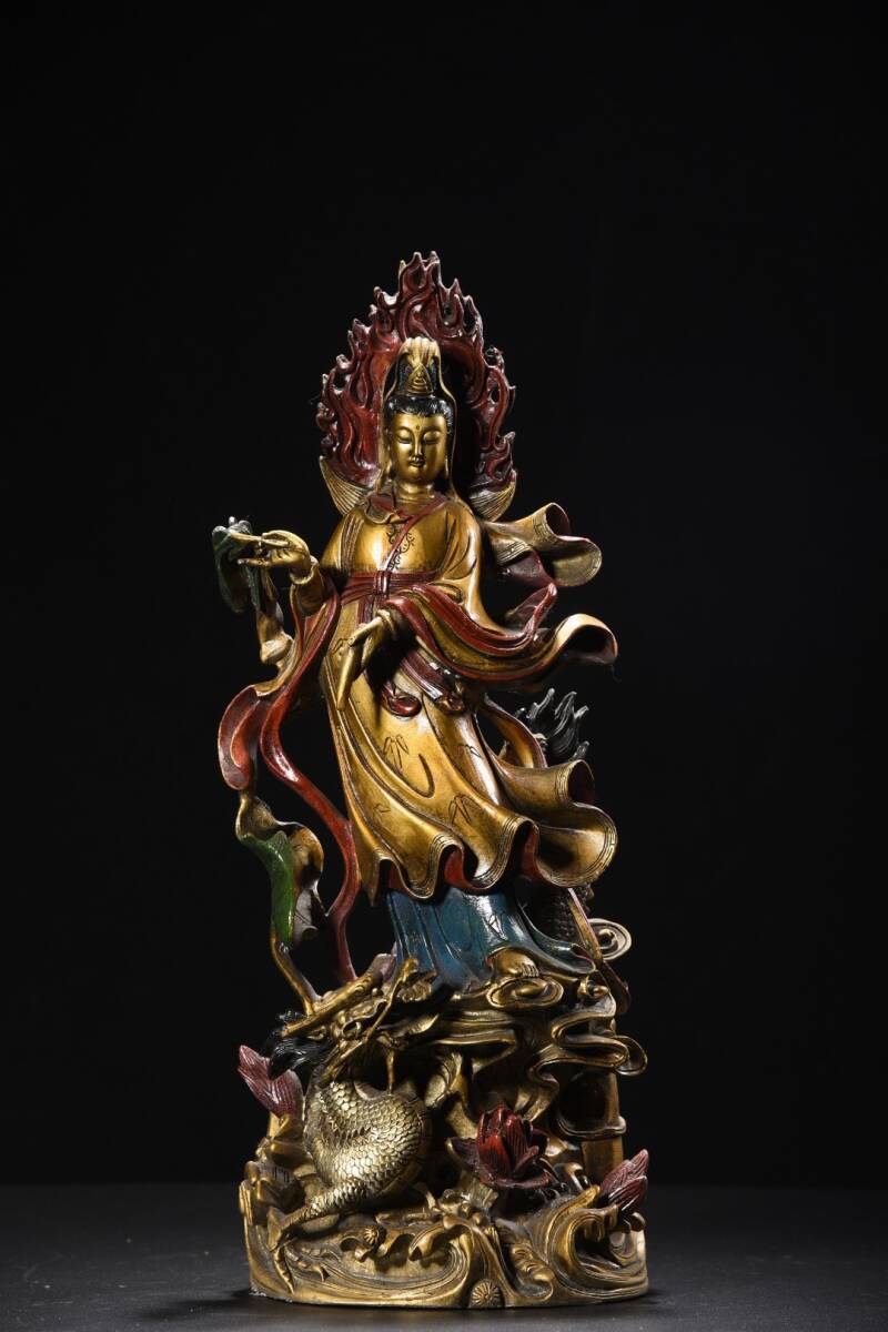 - 清時代 銅製 銅彩絵乘龍觀音像 仏像 仏教古美術 仏教 密教置物 供奉品 極細工 古賞物 古美味 東洋彫刻 時代物 骨董 中国古美術