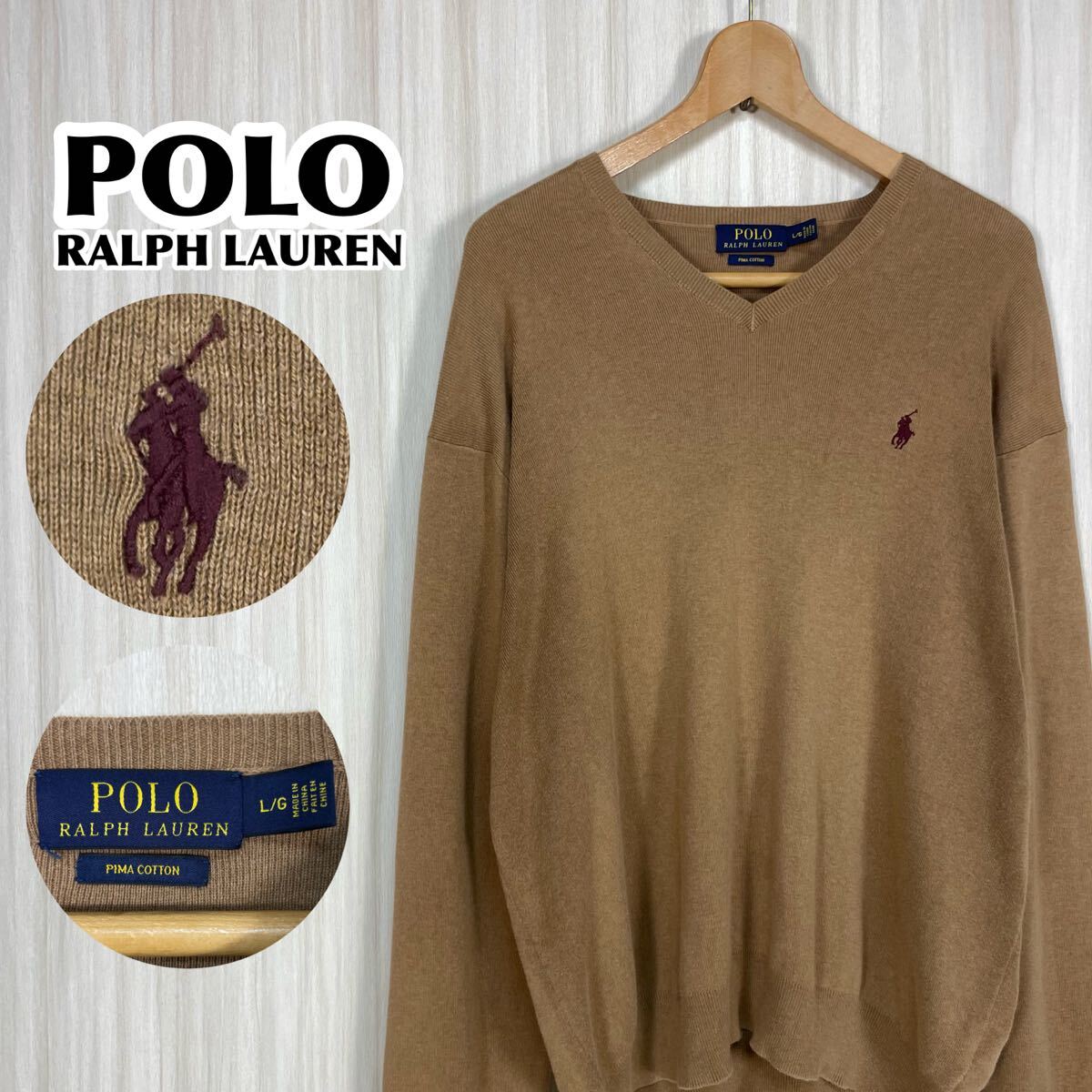 > ☆希少カラー☆現行タグ☆POLO ポロラルフローレン 刺繍ポニー Vネック コットンニット セーター ベージュ ハイゲージ L アメカジ 古着