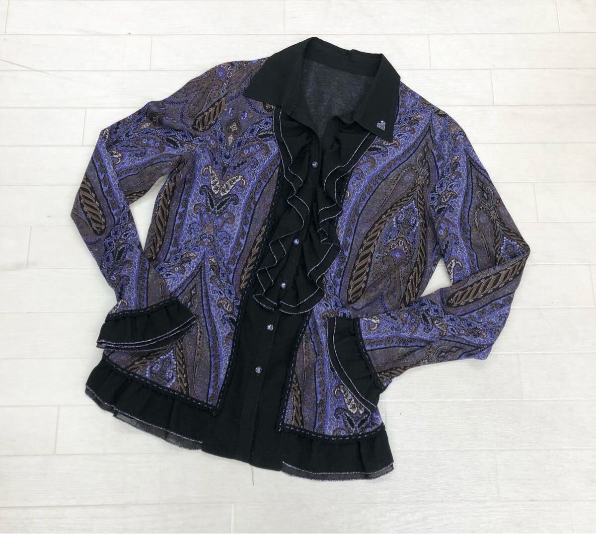 - M3〓 伊太利屋GK フリルシャツ レディース サイズ11 パープル ブラック 総柄 ペイズリー柄 カットソー 長袖ボタンシャツ カジュアル