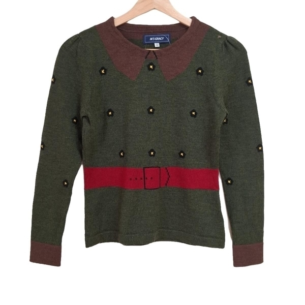 > エムズグレイシー M'S GRACY 長袖セーター/ニット サイズ38 M - カーキ×レッド×マルチ レディース クルーネック/ベルトモチーフ/刺繍