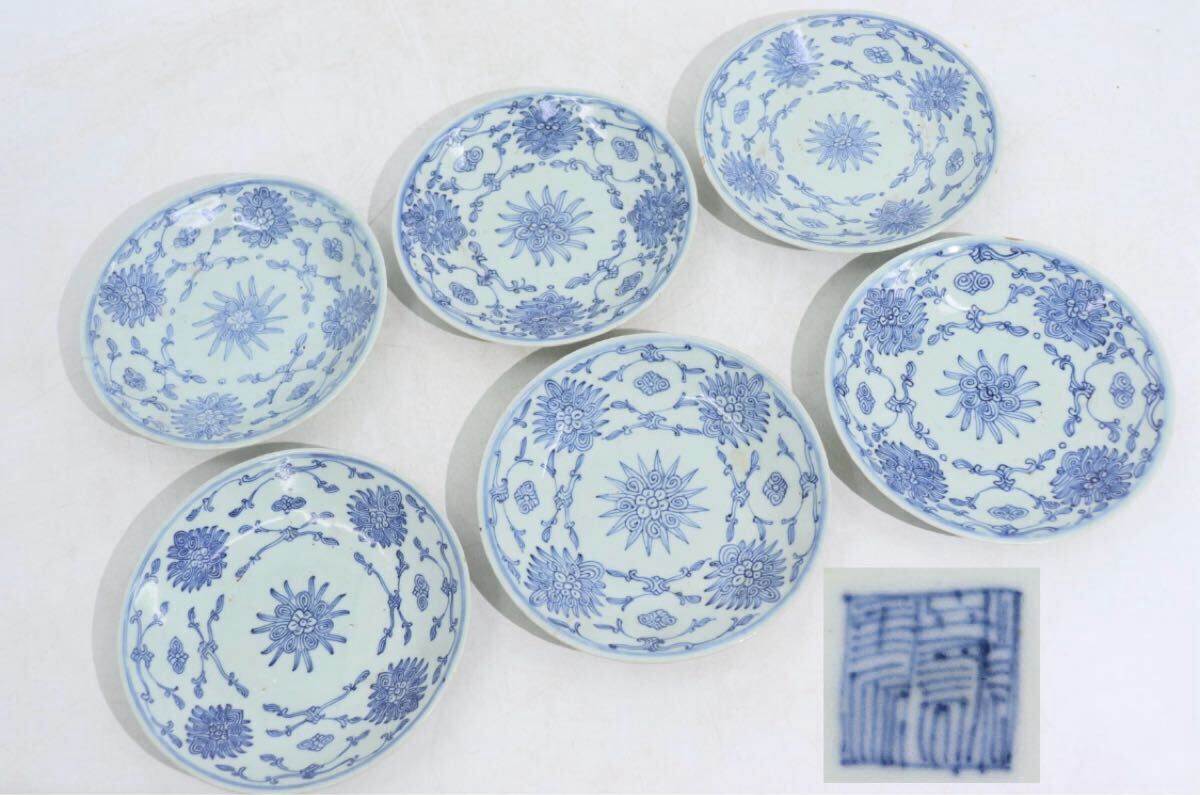 > 大清嘉慶年製 銘 染付 線描 草花紋 皿 六客 / 清 嘉慶 中国美術 新渡 銘々皿 線描き 茶器 煎茶道具 .G935