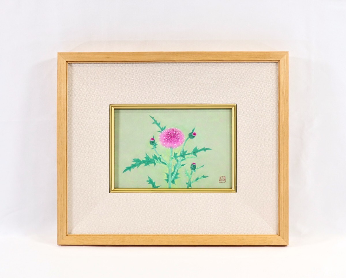 - 真作 渡辺信喜 日本画「薊」画寸 SM 京都府出身 日展理事 横の会所属 山口華楊に師事 自然への深い愛情と優美な色彩感覚で独自の画境 10439