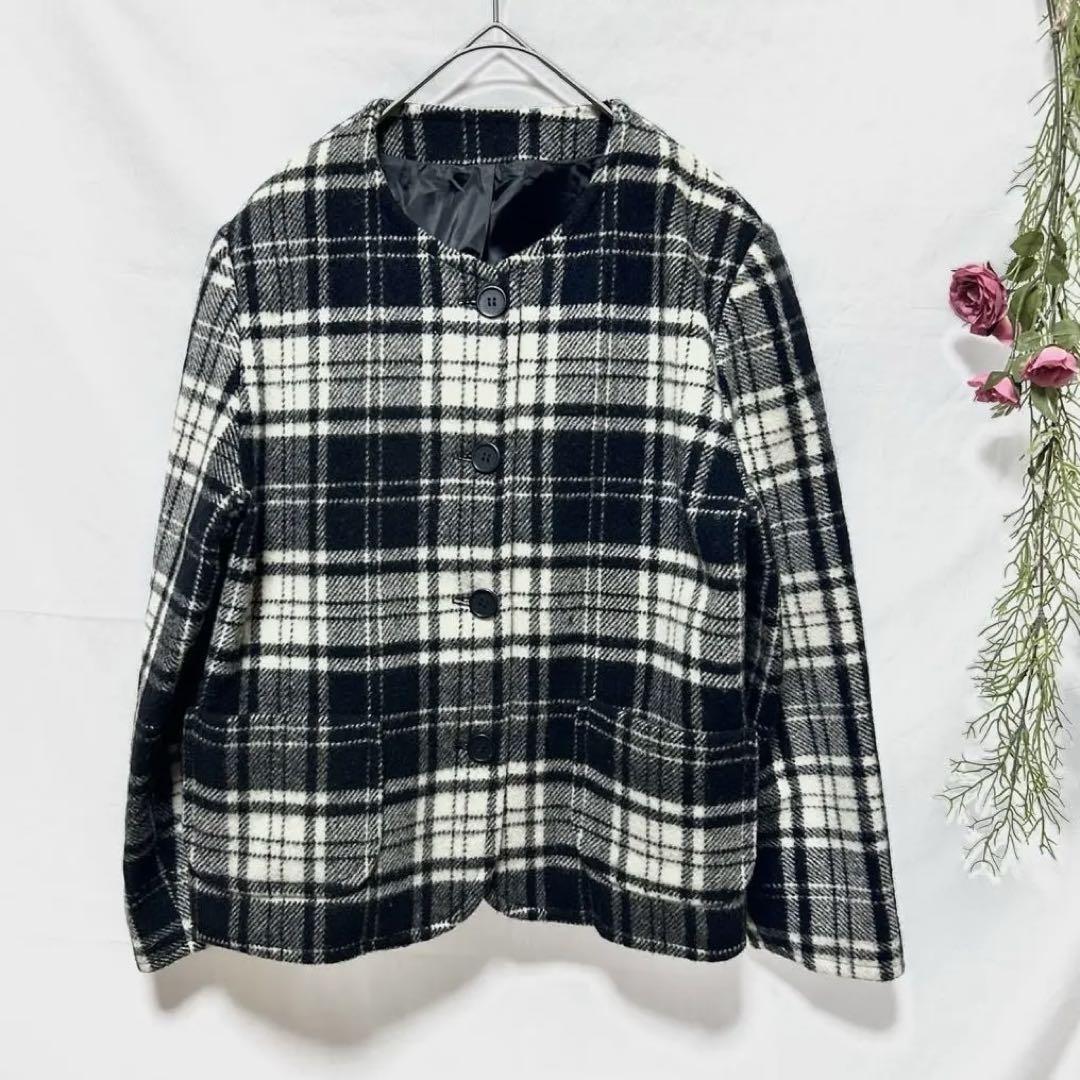 - 【ヴィンテージ】ノーカラー ツイードチェックジャケット ポケット付 白黒