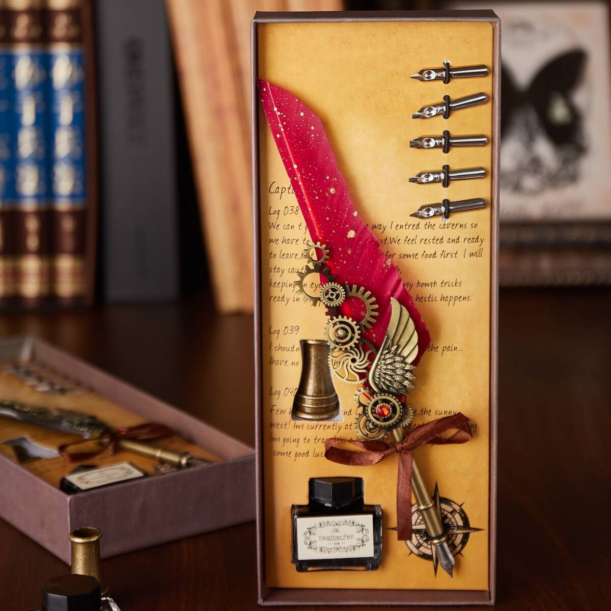 - 万年筆 おしゃれ フェザー 羽根 高級感 レッド 赤 金属 レトロ アンティーク インク瓶 スタンド ペン先5本 軽量 ケース付き 箱付き t5104
