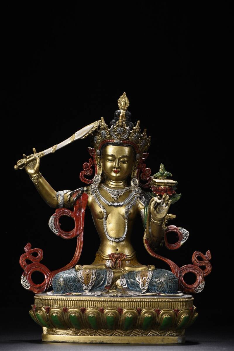 - 【超珍館蔵】銅製 金鍍 彩繪 文殊菩薩像 置物 古賞物 古美術品 稀少珍蔵品