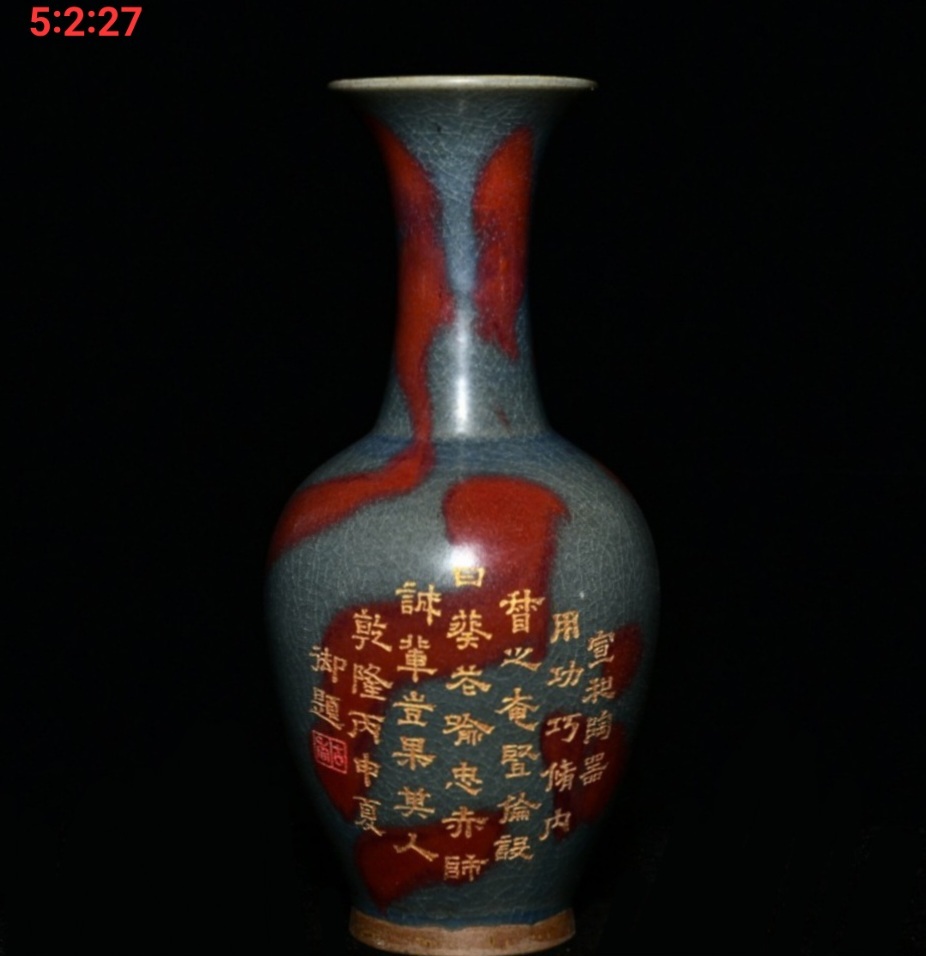 - 旧藏 宋時代 古陶磁器 均窯 窯変釉 描金 御題束口瓶 花瓶 文案置物 極細工 古賞物 古美味 東洋彫刻 時代物 骨董 中国古美術