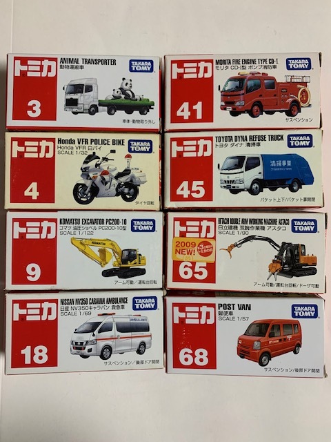 - 当時物 2010年頃 トミー トミカ 定番品 働く自動車8種セット 動物運搬車 白バイ 油圧ショベル 救急車 消防車 清掃車 双腕アスタコ 郵便車
