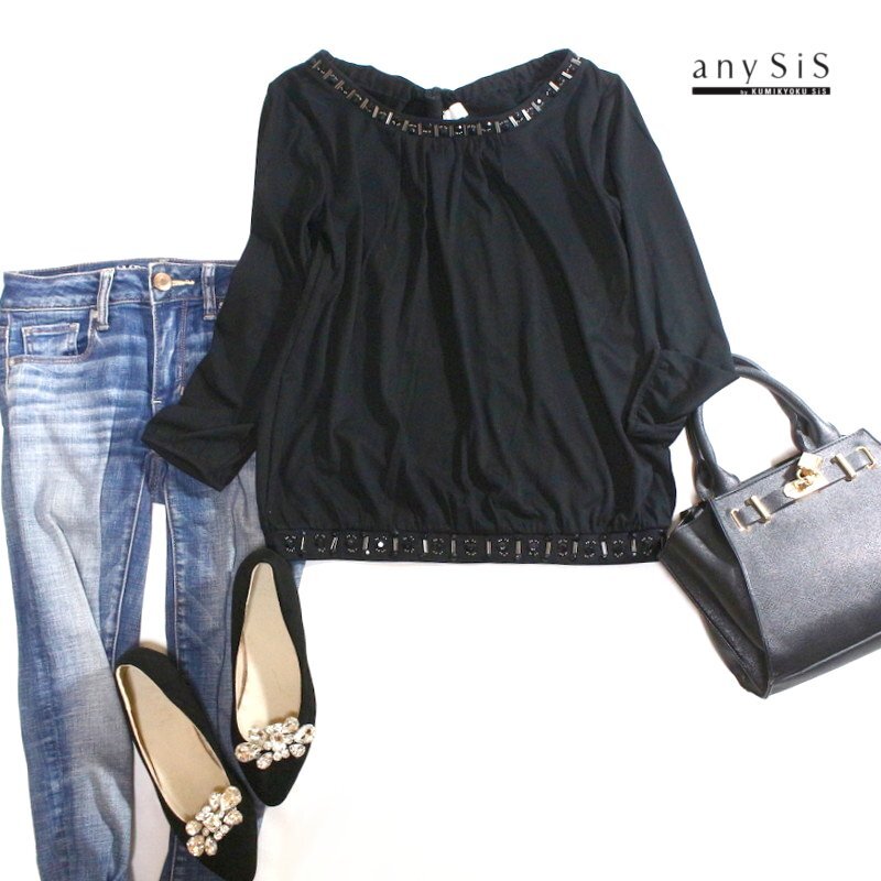 > エニィスィス anySiS 組曲 株)オンワード樫山 合物 8分袖 ビーズ ビジュー 刺繍 Tシャツ生地 カットソー プルオーバー 2 9号 ブラック 黒