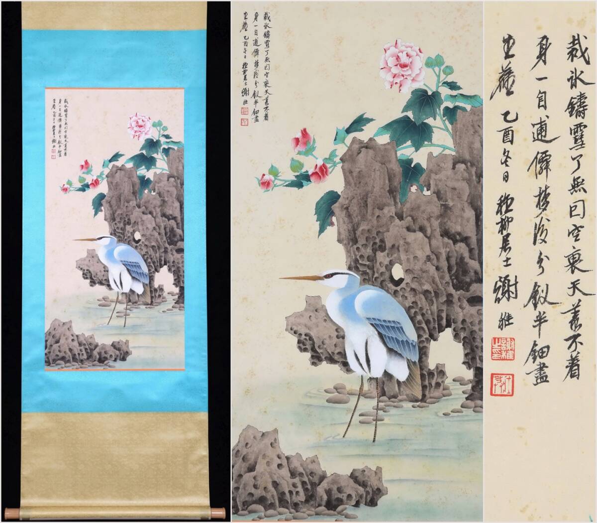> 古美術 掛け軸 中国・近現代 「謝稚柳書」 紙本 【荷塘白鷺図】 立軸 書道 巻き物 肉筆保証 唐物 古画 画心92x45cm LT-250351