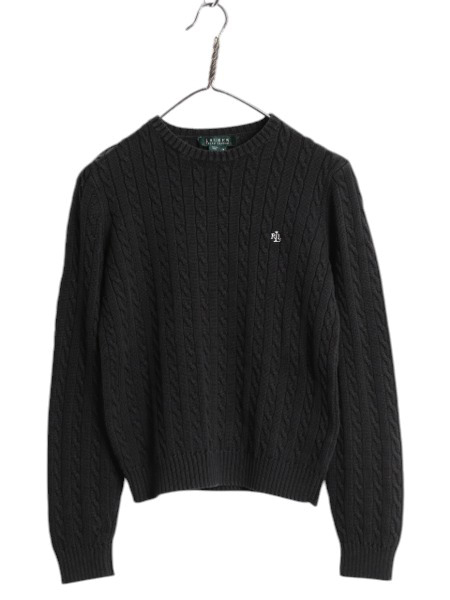 > 90s LAUREN ラルフローレン コットン ケーブル ニット セーター レディース М / オールド ポロ 長袖ニット ワンポイント クルーネック 黒
