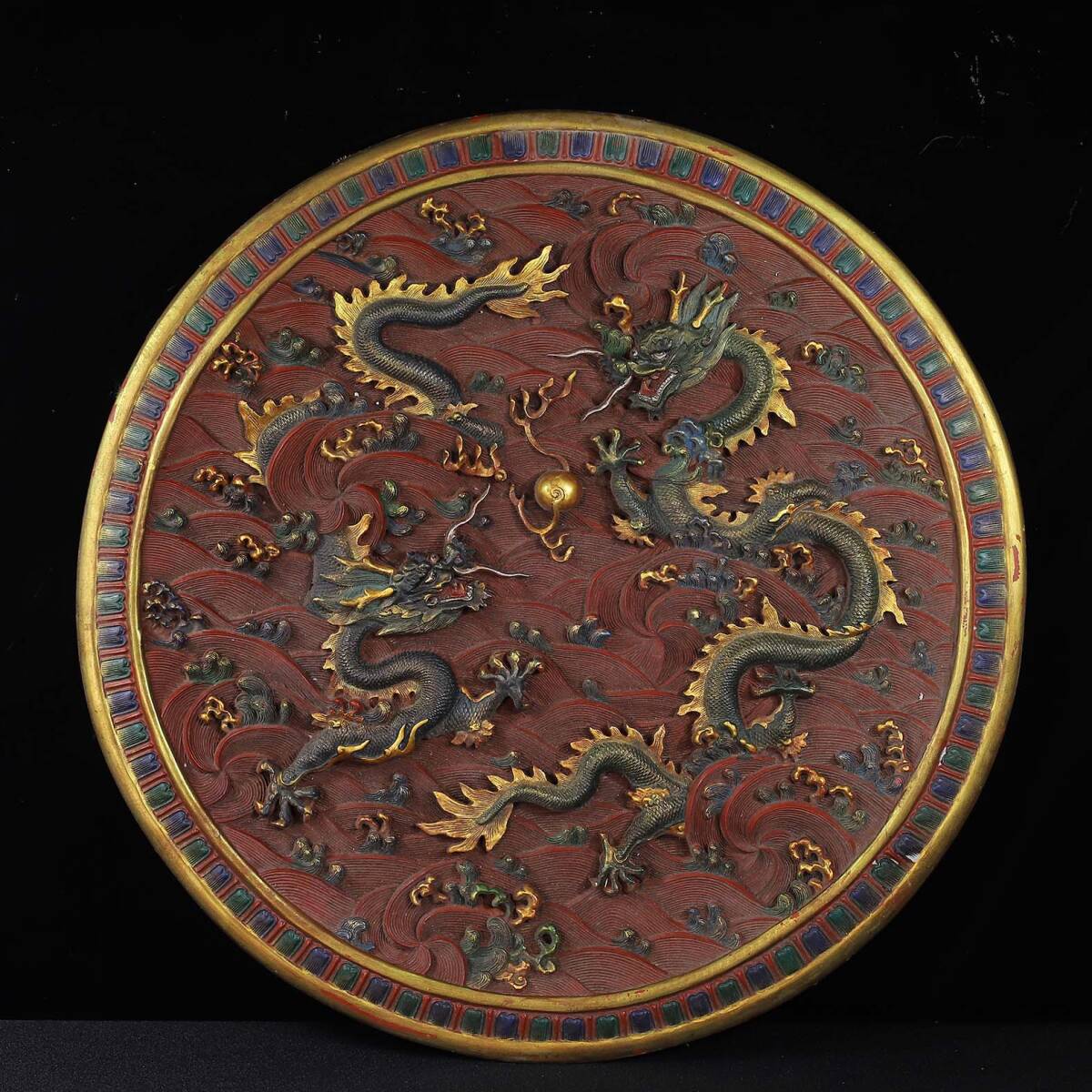 - 唐物 清代 彩色漆器 双龍戯珠 大円盤 観賞皿 置物 中国美術品 時代物 D63